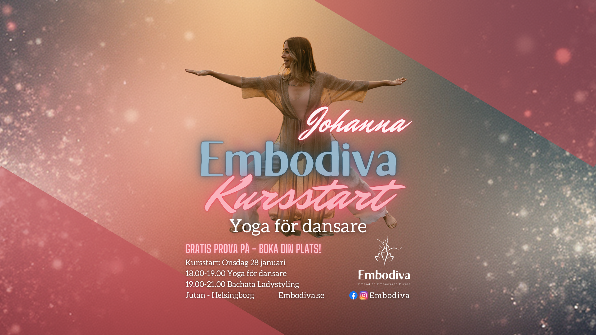 Embodiva är ett helhetskoncept där kropp, själ och rörelse möts. En inbjudan att komma hem till din kropp och väcka din inre kraft. Här möts yoga och dans i en trygg och inspirerande atmosfär där du får landa i kroppen, stärka din självkänsla och uttrycka din feminina energi genom medveten rörelse. Här handlar det inte om prestation eller perfektion utan om att väcka det som redan finns inom dig.